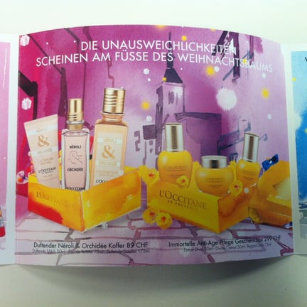 Vor Weihnachten habe ich ein Mailing einer französischen Kosmetikfirma erhalten. Deren Produkte schätze ich eigentlich, aber bei diesem Flyer konnte ich nur die Stirn runzeln: „Die Unausweichlichkeiten scheinen am Füsse des Weihnachtsbaums“ prangte in der Mitte des Prospekts.